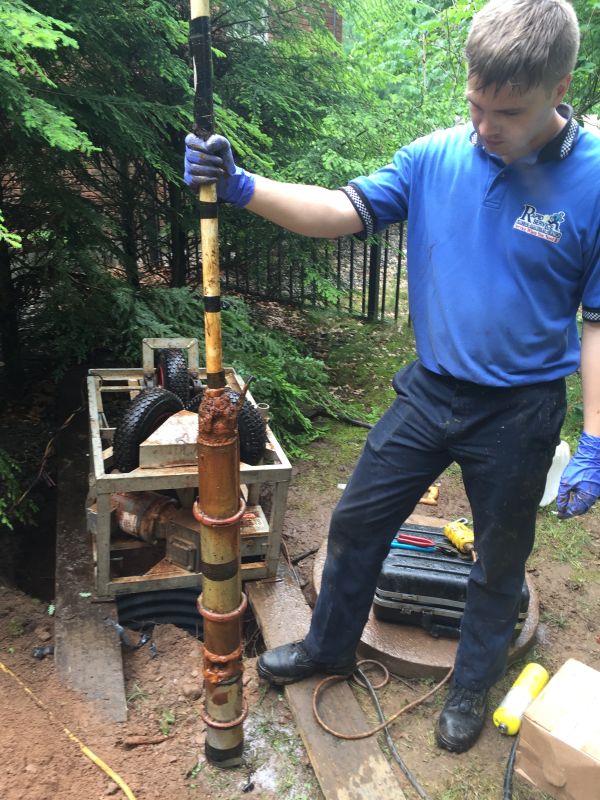 Many Bolton CT homes have a well system. When a homeowner calls us in a panic because there's no water, a dead well pump is usually to blame. There had been a storm the day before and a possible lightning strike. A well pump that's been struck by lightning may not be affected until several days later. The Bolton homeowner has a submersible well system. That means that the well pump is located several hundred feet below ground. There are several troubleshooting steps a plumber technician will take before pulling the pump. In this case, the pump had to be pulled. We have special equipment to both dig out the well AND pull the pump safely. It was determined that the lightning had damaged the pump and it needed to be replaced. You can also see the effects of harsh water quality on plumbing equipment. This pump has a ton of iron on it. Our plumbing team was able to install a new Goulds well pump, along with replacing the well pipe and wire. Our B olton CT customer called in the problem on a Saturday night, and our team was out first thing Sunday morning. By Sunday afternoon, the installations were complete and everything was cleaned up. In the days that followed, our office staff helped the customer provide information to his insurance company for a claim. He got all this done with just one call to Rapid Service LLC!